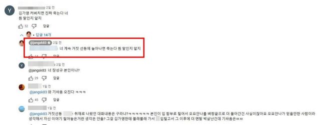 그중 한 누리꾼이 "김가영 커버 치면 진짜 죽는다 너. 뭔 말인지 알지"라는 댓글을 남겼고, 이에 장성규는 "너 계속 거짓 선동에 놀아나면 죽는다. 뭔 말인지 알지"라고 답글을 달았다.