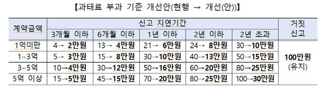 계약금액과 지연 기간에 따라 최소 4만원부터 최대 100만원까지 과태료를 부과하도록 규정하고 있다. 과태료 부담이 너무 과도하다는 인식을 반영해 국토부는 최대 과태료 부과액을 30만원으로 낮추기로 했다.