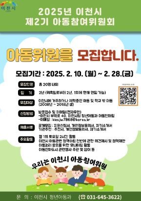 모집 대상은 이천시에 거주하거나 재학 중인 2008년생부터 2018년생 아동과 학교 밖 아동으로, 공개모집과 기관추천을 병행하여 구성하며 특히, 소수집단 아동이 배제되지 않도록 고려할 예정이다. 참여를 원하는 아동은 이천시청 누리집 공고문을 확인하고 지원서류를 방문 또는 이메일로 제출하면 된다.