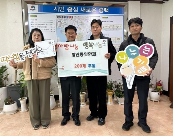 황산뽕잎한과 대표는 “현덕면 황산리의 명물인 황산뽕잎한과를 정성을 담아 준비했으며, 지속적인 사회공헌 활동을 통해 앞으로도 나눔을 실천하고, 지역사회의 소외된 이웃과 함께하는 기업으로 발돋움해 나가겠다”라고 전했다.