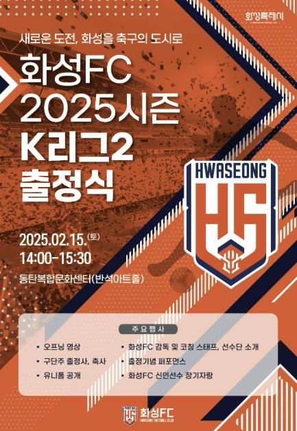 [와이뉴스] 화성FC가 오는 15일 동탄복합문화센터 반석아트홀에서 2025시즌 K리그2 프로 진출을 기념하는 출정식을 개최한다.