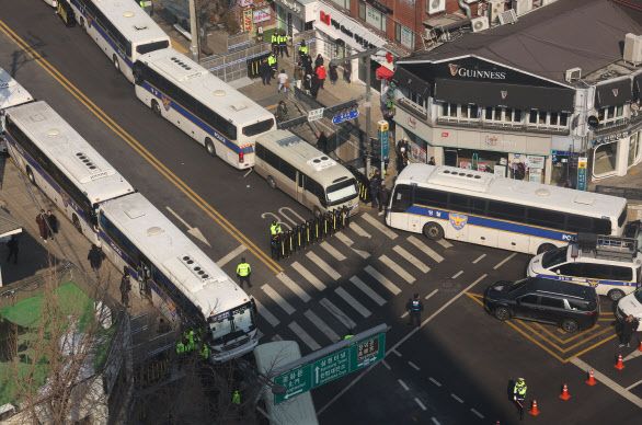 서울경찰청은 이날 오전부터 서울 종로구 헌법재판소 인근에 기동대 45개 부대(2700여명)를 배치해 충돌에 대비하고 있다. 경찰은 헌재를 경찰버스로 둘러쌌다. 헌재 앞 북촌로 4개 차로 중 2개 차로에는 경찰버스 20여대씩 세워져 거대한 차벽을 만들었다.