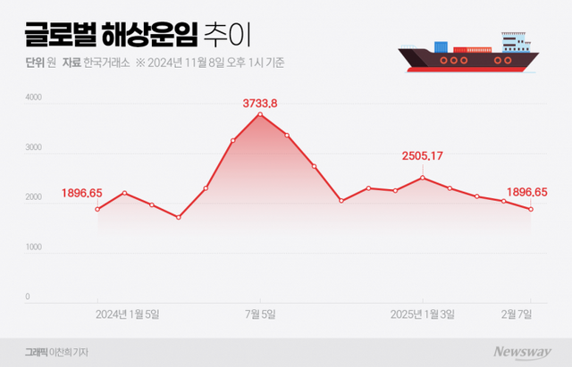 올해 해상운임은 트럼프 정부 출범과 수에즈 운하 봉쇄 장기화 영향 등으로 하락세를 보일 전망이다. 도널드 트럼프 미국 대통령은 현재 강도 높은 관세 인상 조치를 속속 발표하며 전 세계를 압박하고 있다. 현재까지 트럼프 대통령은 철강과 알루미늄에 25% 관세를 적용한다고 밝힌 바 있다.