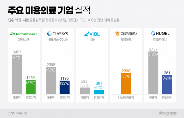 클래시스의 성장세도 두드러진다. 금융정보업체 에프앤가이드는 클래시스의 지난해 연매출이 2398억 원으로 사상 처음 2000억 원을 돌파할 것으로 전망했다. 영업이익은 1195억 원으로 전년 대비 33.4% 증가할 것으로 보인다.