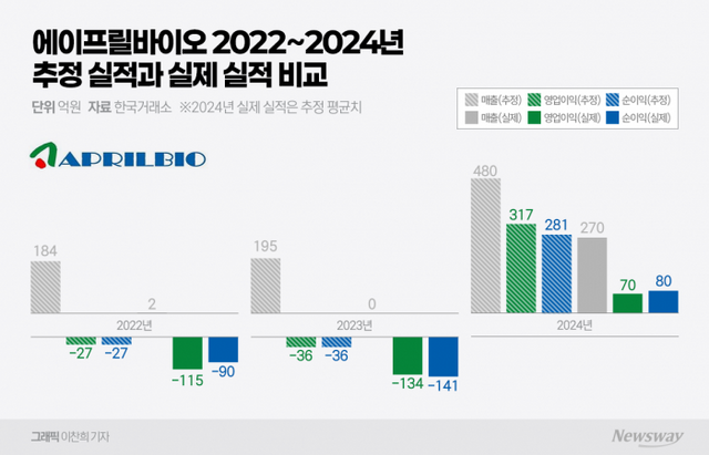 상장 당시 2022년 'APB-R3' 기술이전으로 184억원, 2023년 'APB-R4' 기술이전으로 195억원의 매출을 예상했다. 하지만 기술이전이 지연됐다. 2022년 매출은 2억원에 그쳤고 2023년에는 매출이 없었다. 같은 기간 영업손실은 115억원에서 134억원으로 증가했다.
