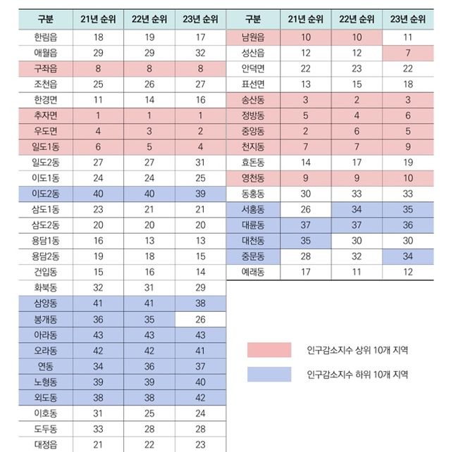 이와 함께 2022년 대비 2023년에 인구감소위험이 커진 것으로 파악된 지역은 봉개동(35위→26위)과 성산읍(12위→7위)이다. 이는 각각 유동 인구의 수와 고령화가 영향을 미친 것으로 판단했다.