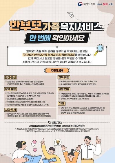 [와이뉴스] 한부모가족을 위해 분야별 정부지원 복지서비스를 모은 '2025년 한부모가족 복지서비스 종합안내서'를 발간합니다. 언제, 어디서나 필요한 정보를 쉽게 확인할 수 있도록 소책자, 전단지, 전자책 등 다양한 형태로 제작하여 배포합니다.