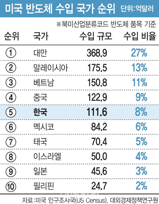 미국의 최대 반도체 수입국은 대만으로 나타났다. 368억 9000만 달러로 비중은 27%에 달한다. 말레이시아(175억 5000만달러), 베트남(150억 8000만달러), 중국(122억 9000만달러) 등이 뒤를 이었다. 한국에서 생산한 메모리가 대만 TSMC 등 다른 나라에서 조립·가공을 거쳐 미국으로 넘어가는 구조다.