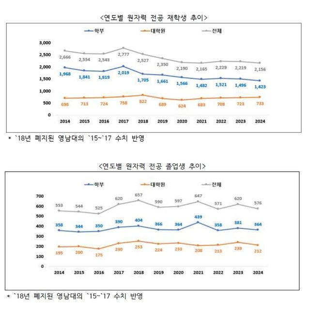 한국원자력산업협회가 원자력 전공을 운영하는 전국 17개 대학(경북대, 단국대, 동국대, 부산대 등)을 대상으로 실시한 ‘원자력산업실태조사’에 따르면, 2024년도 원자력 전공 재학생 수는 총 2156명으로, 2023년의 2219명에서 2.8% 감소한 것으로 나타났다. 그중 학사 과정은 1423명, 석사 과정은 340명, 박사 과정은 244명, 석·박사 통합과정은 149명이었다. 학사 과정 학생 수는 지난해 1496명에서 1423명으로 73명 감소하며 가장 큰 감소폭을 보였다.