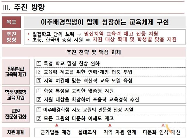 이를 위해 교육부는 (가칭) 「이주배경학생 교육지원 법률」 제정을 통해 특정 학교에 이주배경학생이 과도하게 밀집할 경우 시도교육청이 지역 여건에 따라 밀집도를 완화할 수 있도록 관련 법적 근거 마련을 추진하겠다는 계획이다.