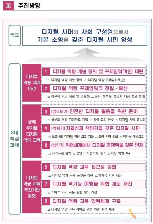 ■ 영유아부터 성인까지 모두를 위한 디지털 역량 교육 추진 =이와 함께 교육부는 ‘모두를 위한 디지털 역량 교육’을 추진한다. 영유아부터 성인까지 모두가 디지털 시대의 필수 소양인 디지털 역량을 갖추고, 학생들이 인공지능(AI) 디지털교과서를 비롯한 디지털 기술을 올바르고 창조적으로 활용하는 것을 지원하기 위해 마련했다.