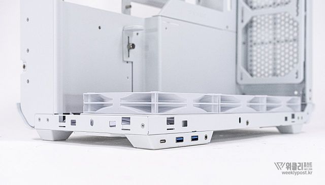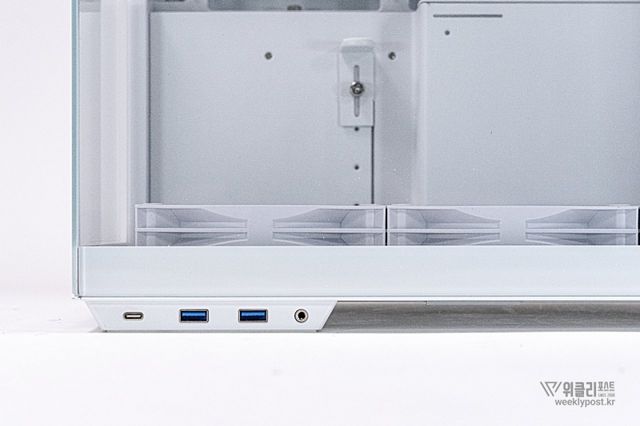 전면 I/O 포트는 케이스 하단 왼쪽에 배치됐다. 덕분에 책상 왼쪽에 배치하면 포트를 쉽게 활용할 수 있다. 포트 구성은 USB 3.2 Type-C 1개, USB 3.2 Gen1 Type-A 2개, 오디오 포트로 꼭 필요한 기능만 담았다.