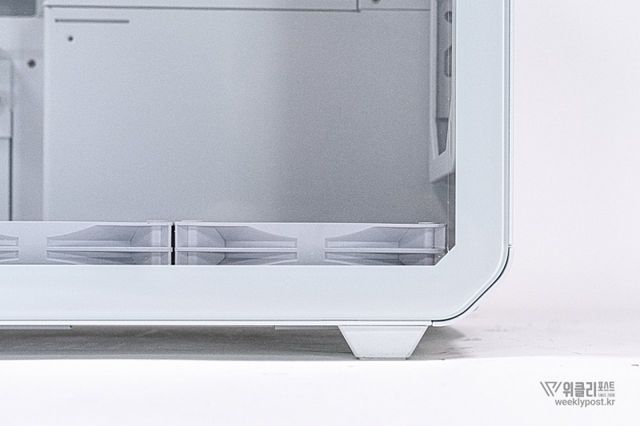 전면 디자인은 비대칭적으로, 왼쪽 모서리가 사선으로 디자인되어 독특한 인상을 준다. 강화유리는 견고하며, 블랙 프레임과 조화를 이뤄 깔끔한 마감을 선사한다. 내부에는 금속 프레임과 ARGB 조명 스트립이 적용돼 감각적인 조명 효과를 연출할 수 있다. 측면 강화유리 패널 또한 견고한 프레임으로 보강돼 내구성이 뛰어나다.