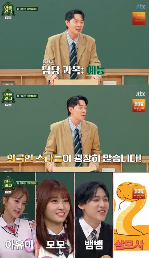 민니는 "저 뱀뱀이랑 친한데 얘기 들어본 적 없다"라고 의의를 제기하며 웃음을 유발했다. 붐은 아랑곳 않고 "선생님 얘기 잘 들으면 한국에서 스타 될 수 있다"라고 자부했다.
