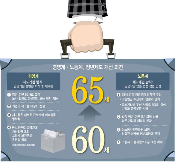문제는 정년 제도 재설계 방식을 놓고 노사 간 입장이 첨예하다는 점이다. 노동계는 법정 정년을 연금수급 개시 나이에 맞춰 연장해야 한다는 입장인 반면, 경영계는 현행 정년을 유지한 채 정년퇴직 후 재고용 제도를 도입해야 한다고 주장하고 있다.