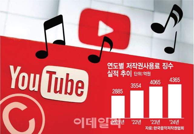 11일 업계에 따르면, 한국음악저작권협회(KOMCA)는 지난해 총 4365억원의 저작권료를 징수하며 역대 최고 수입을 기록했다. 2023년 저작권료가 처음으로 4000억원을 돌파한 이후에도 전년 대비 7.38% 성장한 수치를 기록했다. 이러한 성장은 유튜브의 기여가 컸다는 분석이다. 전체 저작권료 중 글로벌 스트리밍 플랫폼이 포함된 영상물 전송 서비스에서 1000억원 이상을 징수하는 성과를 올렸다.