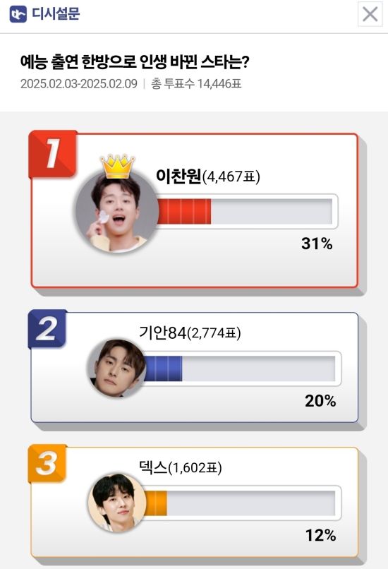 디시설문 갤러리는 지난 2월 3일부터 2월 9일까지 진행된 설문조사에서 이찬원이 "예능 출연 한방으로 인생 바뀐 스타" 1위로 선정됐다고 밝혔다. 그는 총 14,446표 중 4,467표(투표율 약 20%)를 얻어 1위에 올랐다.