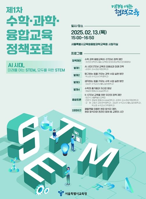 [파이낸셜경제=김영란 기자] 서울특별시교육청은 오는2월 13일,‘AI 시대, 미래를 여는 STEM, 모두를 위한 STEM’을 주제로 '제1차 수학·과학·융합교육(K-STEM) 정책 포럼'을 서울특별시교육청융합과학교육원에서 개최한다.