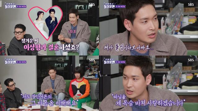 또 정겨운은 결혼 당시 장인의 반대에 부딪혔다고 밝혔다. 10세 연하 아내는 초혼이었던 터. 정겨운은 “장인어른 성격이 강하시고 말씀을 많이 안 하시는 분이다. (결혼하겠다는 말에) 몰래 차에서 우셨다고 들었다”며 “저는 갔다온 사람이니까. 저도 장인어른의 마음을 이해했다”고 말했다.