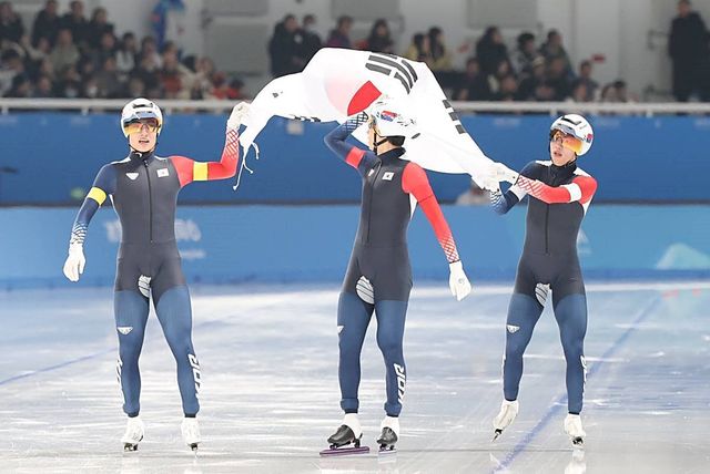 지난 11일(현지시간) 중국 헤이룽장성 하얼빈 스피드 스케이트 오벌에서 열린 하얼빈 동계아시안게임 스피드 스케이팅 남자 팀추월에서 이승훈(왼쪽부터), 박상언, 정재원이 2위로 경기를 마친 뒤 태극기를 들고 세리머니를 하고 있다. 대한민국은 3분 47초 99로 중국에 이어 은메달을 차지했다 / 뉴스1