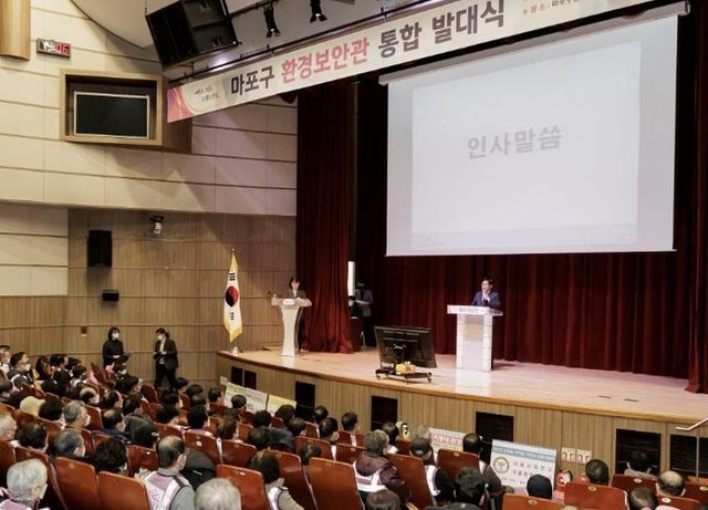 | ▲ 박강수 마포구청장이 마포구 환경보안관 통합 발대식에서 인사말을 전하고 있다. |