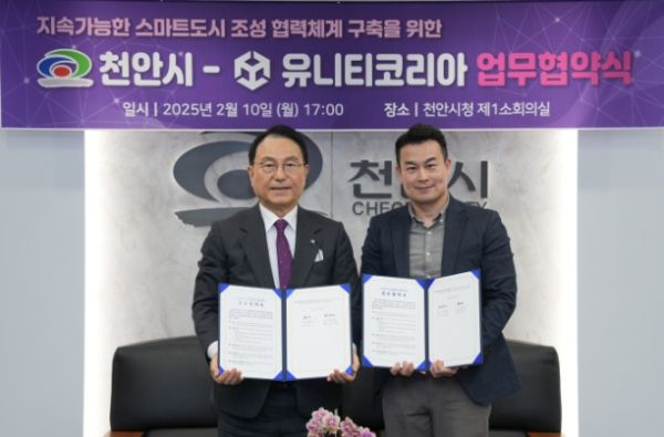 박상돈 천안시장과 송민석 유니티코리아 대표이사는 지난 10일 천안시청 제1소회의실에서 업무협약을 체결했다.