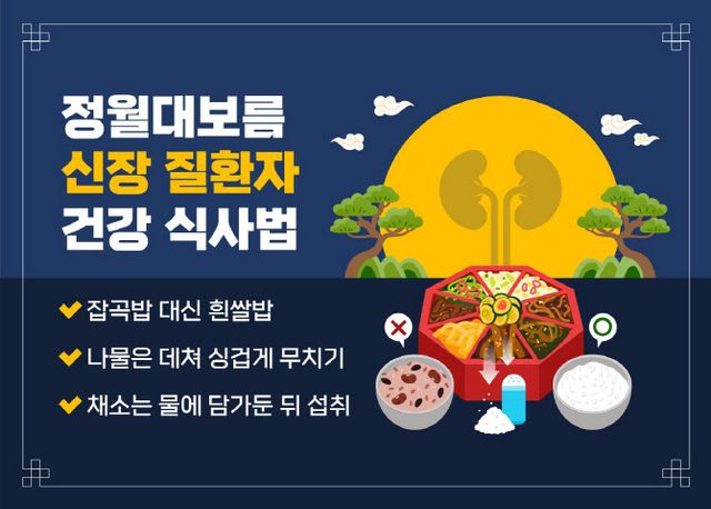 또한 나트륨과 당분의 섭취도 최대한 자제하는 것이 필요하다. 나트륨을 일반인들과 같은 양으로 섭취하면 혈압이 상승하고 신장 기능이 더 나빠질 수 있다. 정월대보름에 먹는 나물도 무칠 때 소금, 간장 등 염분이 많이 들어간 양념을 사용하기 때문에 되도록 싱겁게 조리한다. 나물에는 칼륨 성분이 많이 함유돼 있는데, 칼륨은 수용성이므로 조리 전 2시간 정도 미리 물에 담가둔 뒤 건져내 삶거나 데쳐 무치면 좋다. 채소는 칼륨 함량이 적은 배추, 오이, 콩나물 등을 대체해 먹는 것도 좋다.