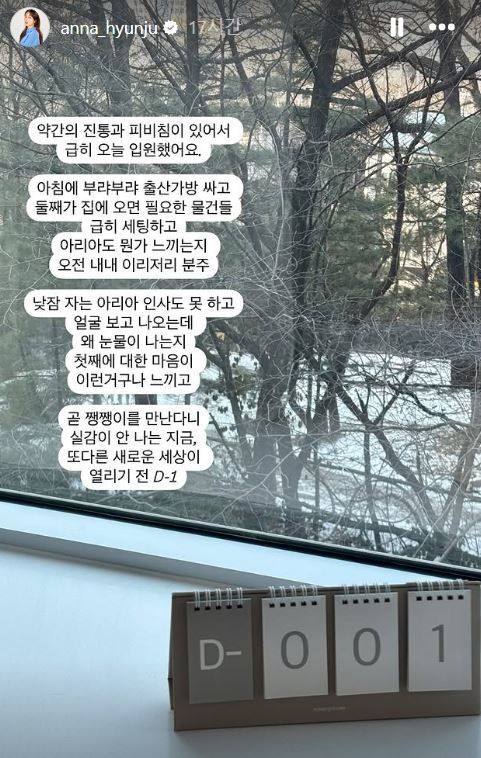 지난 11일 임현주는 인스타그램에 "약간의 진통과 피 비침이 있어서 급히 오늘 입원했어요. 아침에 부랴부랴 출산 가방 싸고 둘째가 집에 오면 필요한 물건들 급히 세팅하고 아리아도 뭔가 느끼는지 오전 내내 이리저리 분주"라는 글을 남겼다.