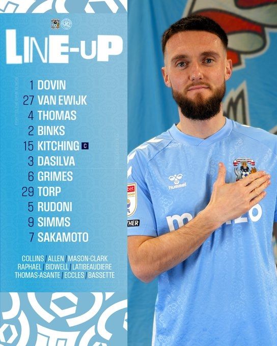 첼시의 전설적인 미드필더 프랭크 램파드 감독이 지휘하는 홈 팀 코번트리는 3-4-2-1 전형을 꺼냈다. 올리버 도빈이 골문을 지켰고 바비 토마스, 루이스 빙크스, 리암 키칭이 백3를 구축했다. 빅토르 오베가르드와 맷 그라임스가 중원에 배치됐고 밀란 판에베이크와 제이 다실바가 윙백으로 출전했다. 사카모토 다쓰히로와 잭 루도니가 2선에서 최전방의 엘리스 심스를 지원했다.