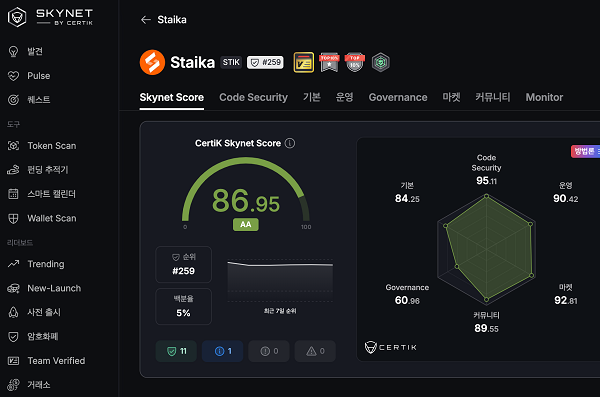 [뉴스로드] 지난 2025년 2월 6일, 스타이카 프로젝트는 CertiK(써틱) 보안 평가에서 86.95점을 기록하며 AA 등급을 달성하였다. 이는 지난해 3월 20일, 써틱 보안 등급 A를 획득한 이후 1년이 채 되지 않아 자체 최고 등급을 갱신한 것이다.