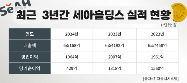 당기순이익을 살펴보면 상황은 더 심각하다. 2022년까지만 해도 1561억원이던 세아홀딩스 당기순이익은 2023년 1318억원으로 15% 감소한 데 이어 지난해엔 429억원을 벌어들이는 데 그쳤다. 전년 대비 무려 67.5% 급감한 수치다.