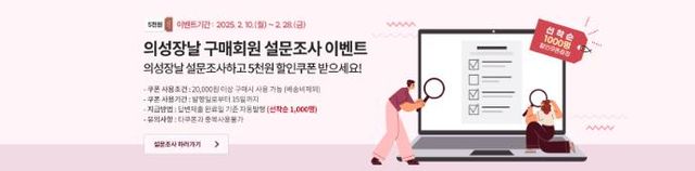2월 10일부터 2월 28일까지 의성장날 이용 고객들의 소중한 의견을 듣고 쇼핑몰 운영에 반영하여 더 나은 서비스를 제공하고자 소비자 설문조사를 진행하는데, 참여하는 구매 고객 선착순 1,000명에게 5,000원 할인쿠폰을 발행할 예정이다.