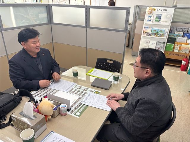 성기황 의원은 2월 10일 경기도의회 군포상담소에서 군포의왕교육지원청 관계자로부터 군포초등학교 및 군포중학교의 개선이 시급한 현안사항을 보고받고 해결방안을 논의했다.(사진=경기도의회)