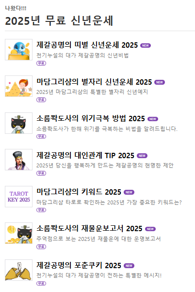 이외에도 '냉정하고 솔직한 쪽집게 감정', '후련한 토정비결', '출사표 비책', '타로 예지', '핵심 분석' 등 재미있게 점칠 수 있는 다양한 신년운세 상품도 준비되어 있다.
