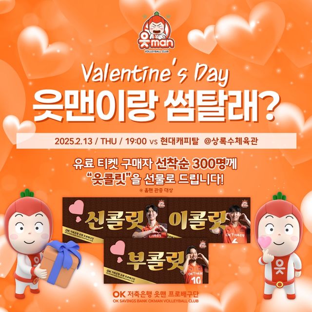우선 13일 상록수체육관을 찾는 유료 관중 선착순 300명에게는 발렌타인데이를 앞두고 팬들에게 특별한 초콜릿을 선물한다. 선수들의 사진이 들어간 '읏콜릿'으로, 이민규·신호진·부용찬 버전의 초콜릿이 팬들을 찾아간다.