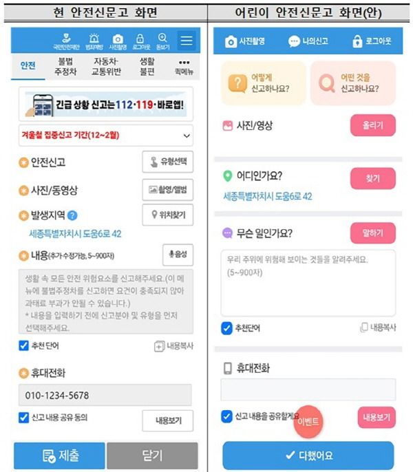 이에 사용자를 어린이에 맞춘 '어린이 안전신문고'를 도입해 어린이가 주변의 재난안전 신고를 손쉽게 할 수 있도록 한다.