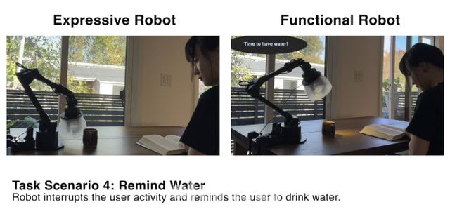 예를 들어 “오늘 날씨 어때?”라는 질문에 기능형 로봇은 날씨를 안내했다. 반면 표현형 로봇은 날씨를 보기 위해 창 밖을 바라본 이후 날씨를 알려줬다. 표현형 로봇은 고개를 흔들거나 음악에 맞춰 춤을 추는 등 감정을 실제로 표현하는 듯한 움직임을 보였다. 물을 마실 시간을 알려줄 때에도 표현형은 물컵을 밀어줬고, 기능형은 물 마실 시간이라며 안내를 했다.