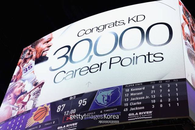 듀란트는 12일(한국시간) 미국 애리조나주 풋프린트 센터에서 열린 멤피스 그리즐리스와의 홈 경기에 선발 출전, 팀 내 최고인 34득점을 책임졌다. 피닉스는 112-119로 무릎 꿇었으나 시즌 15번째 '한 경기 30득점 이상'을 해낸 듀란트의 활약이 빛났다. 특히 이날 전까지 2만9974점을 기록 중이던 듀란트는 3쿼터 후반 자유투로 대망의 3만 득점을 달성했다.