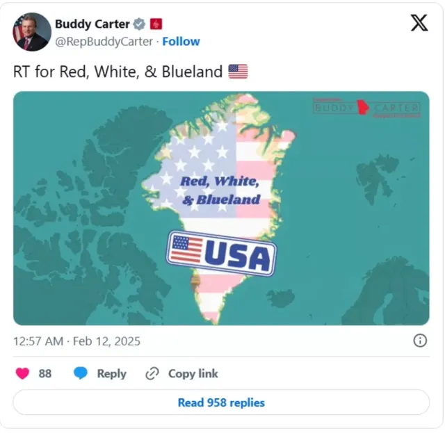 공화당 버디 카터 의원이 그린란드를 매수하고 이름을 '레드, 화이트, 블루랜드'로 바꾸자고 제안