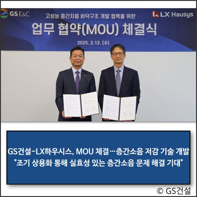 GS건설은 서울 종로구 GS건설 사옥에서 '고성능 층간차음 바닥구조 개발 협력'을 위한 업무협약을 체결했다고 12일 밝혔다. 현장에는 조성한 GS건설 부사장(CTO)과 강성철 LX하우시스전무(경영전략부문장)등이 참석했다.