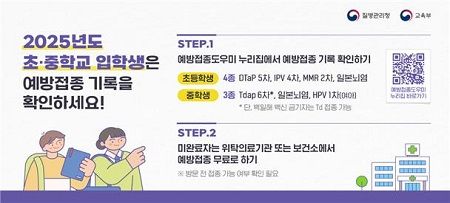 2025년도에 입학하는 초·중학생도 예방접종내역을 확인하고 접종을 완료하지 않은 경우 가까운 위탁의료기관(보건소)을 방문해 무료로 접종받을 수 있다.