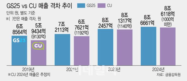 양사의 매출 격차는 매년 줄어드는 추세다. 2019년 9130억원(GS25 6조8564억원·CU 5조9434억원)에 달했던 매출 격차는 2021년 4492억원(GS25 7조2113억원·CU 6조7621억원)으로 줄었다. 2023년에는 GS25와 CU의 연매출이 각각 8조2457억원, 8조1317억원까지 커진 가운데 매출 격차가 1140억원까지 감소했다. 이제는 차이가 1000억원도 채 안 나는 셈이다.