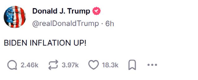 트럼프 대통령은 12일(현지시간) 1월 물가 상승 소식에 자신이 만든 SNS ‘트루스’ 계정에 “Biden Inflation Up”이라는 짧은 메시지를 남겼다.