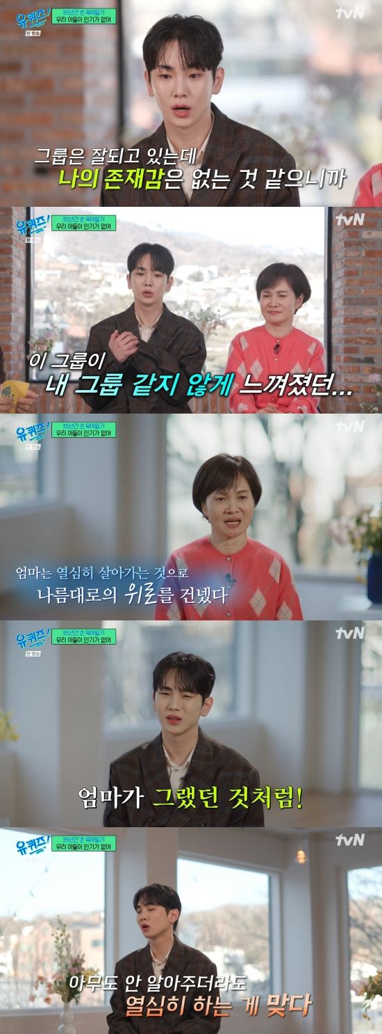 유재석은 "혹시 어머님이 이 이야기하시는 거 알았냐"라며 궁금해했고, 키는 "나중에 '처음엔 좀 힘들었다. 너무 하고 싶었던 직업인데 결과가 바로 따라와 주지는 않으니까 그런 마음이 힘들었는데'라고 했다. 엄마 아빠랑도 그 이야기를 엄청 많이 했다더라. '자기도 속상할 텐데 우리 아무 이야기하지 말고 있자. 자기가 제일 속상할 텐데' 이런 식으로 이야기를 나눴다는 걸 나중에 듣긴 들었다"라며 못박았다.