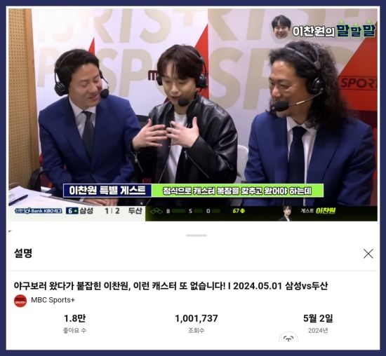 이에 그의 야구 중계 영상은 꾸준히 사랑을 받았고, 최근 100만 뷰를 돌파했다.
