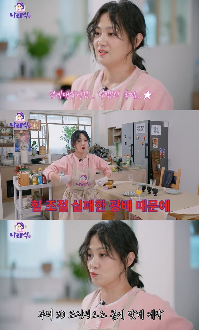 박나래는 "이번에는 3D 프린팅을 사용해서 내 몸에 맞게 제작을 하고, 피팅을 어제 했다. 딱 맞아서 '너무 좋다' '다행이에요' 하고 어깨를 펴는데, (힘 조절 실패한) 광배 때문에 깨졌다. 수리 들어갔다"고 고백해 현장을 박장대소하게 만들었다.