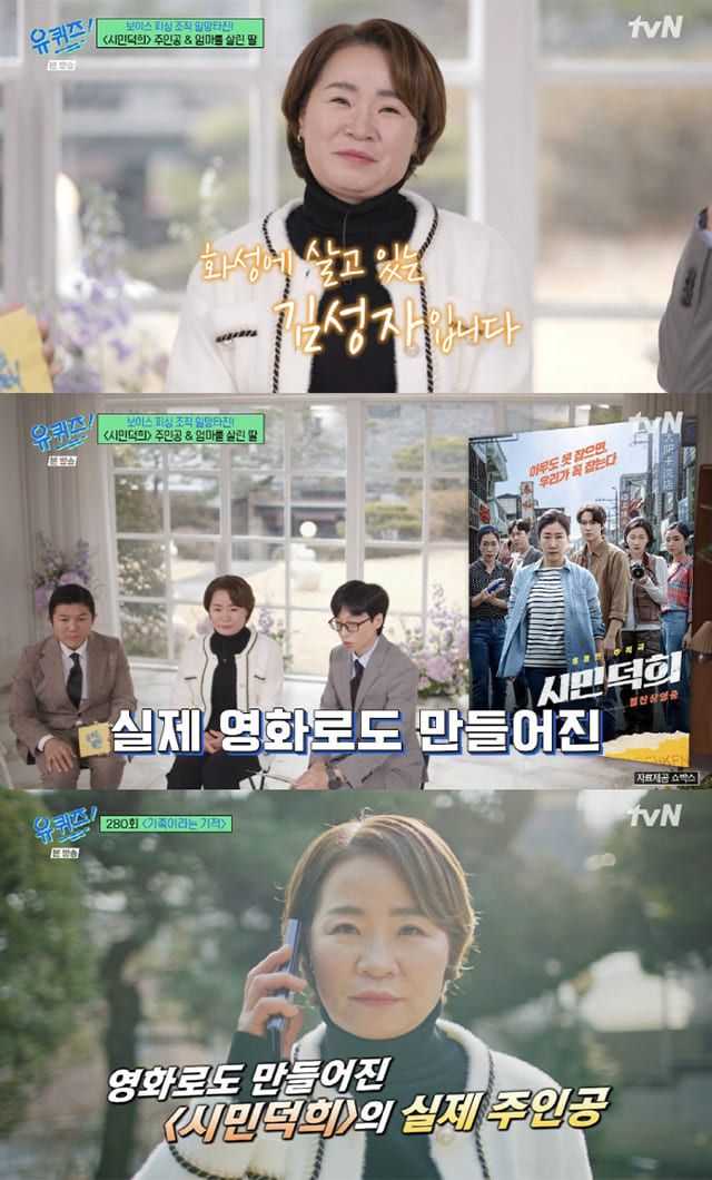 12일 밤 방송된 tvN예능프로그램 ‘유 퀴즈 온 더 블럭’에서는 영화 ‘시민덕희’의 실제 모델인 김성자 씨가 게스트로 출연했다.