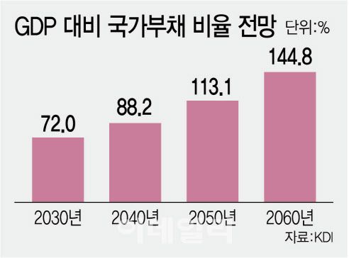 앞서 한국개발연구원(KDI)는 앞으로 복지비 등 의무지출이 크게 늘면서 2050년이면 국내총생산(GDP) 대비 국가채무 비율이 113%에 이를 것이라는 전망을 내놨다.