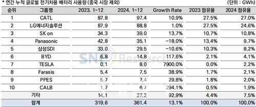BYD(비야디)는 무려 117.6% 성장한 14.8GWh의 배터리 사용량을 달성하며 6위에 올랐다.