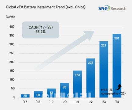 13일 에너지 전문 시장조사업체 SNE리서치에 따르면 지난해 1∼12월 중국 시장을 제외한 세계 각국에 등록된 순수전기차·플러그인하이브리드차(PHEV)·하이브리드차(HEV)에 탑재된 배터리 총사용량은 361.4GWh(기가와트시)로, 전년보다 13.1% 증가했다.